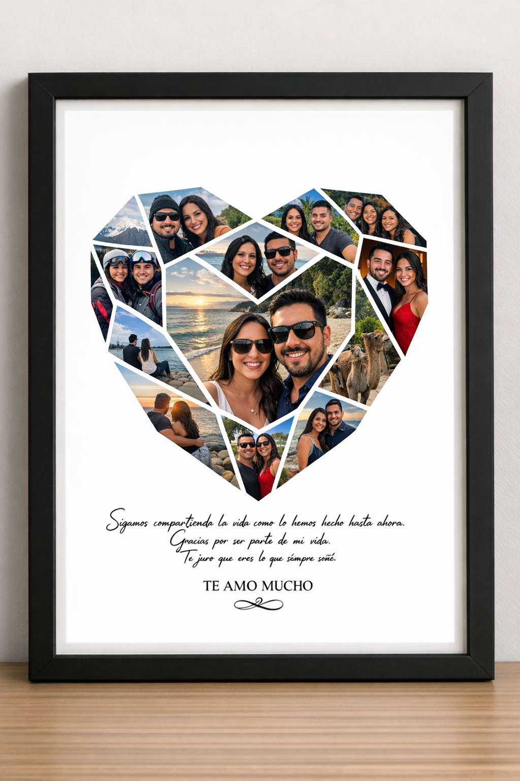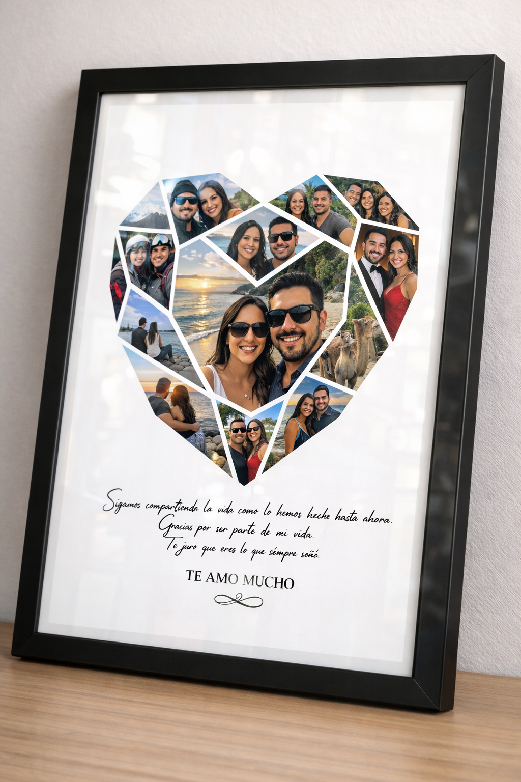 Cada cuadro es creado especialmente para ti, utilizando tus propias fotografías para formar un collage único en forma de corazón, acompañado de un mensaje emotivo que convierte este producto en un regalo perfecto para sorprender a alguien especial.