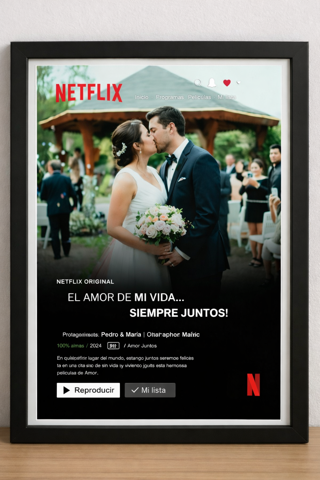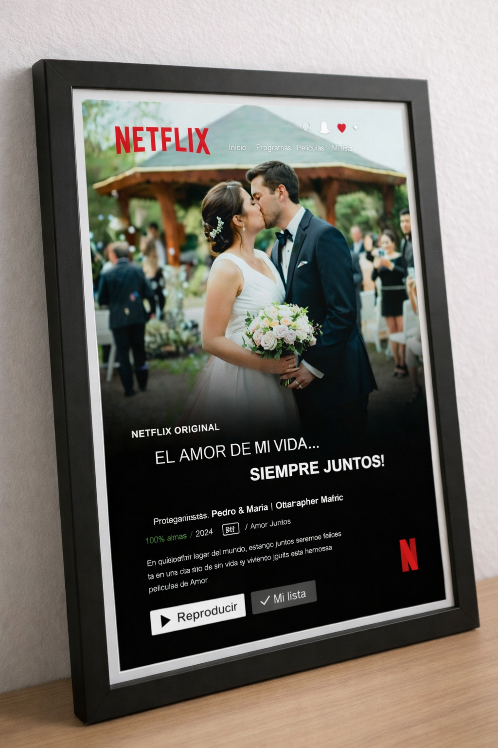 Haz que tu historia de amor se vea como una película inolvidable con nuestro cuadro personalizado estilo Netflix. Este diseño creativo transforma tu fotografía favorita en un póster inspirado en la estética de las plataformas de streaming, convirtiendo tus recuerdos en una obra divertida, romántica y totalmente única.