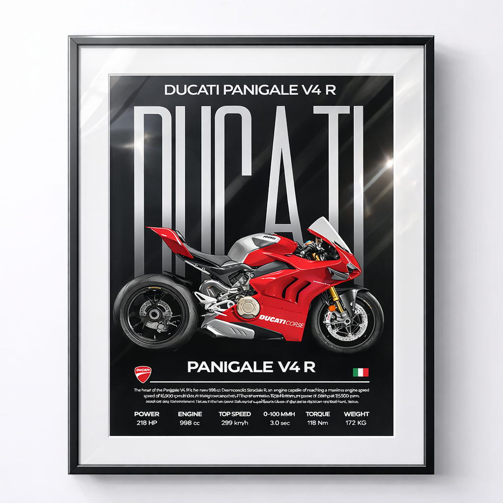 El cuadro presenta un diseño gráfico impactante con la legendaria Ducati Panigale V4 R, una de las superbikes más icónicas del mundo, destacando su estética agresiva, ingeniería de alto rendimiento y espíritu deportivo italiano. La composición incluye detalles técnicos del modelo, lo que convierte esta pieza en una mezcla perfecta entre arte, diseño y pasión por la velocidad.
